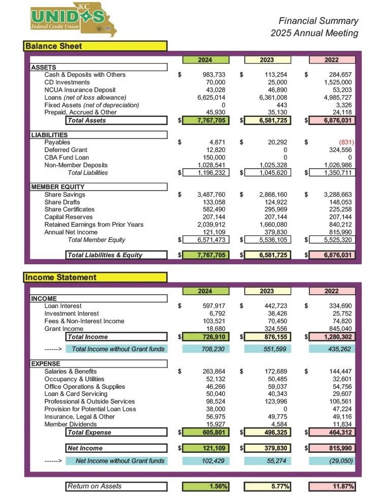 At KC UNIDOS FEDERAL CREDIT UNION, we believe in keeping our members informed every step of the way. Our 2024 Annual Report shares a clear picture of how we’ve grown together over the past year. Inside, you’ll find our financial records, highlights of what we’ve accomplished as a community, and the ways we continue working to support your financial goals. Thank you for trusting us to be part of your journey—your success is our success!